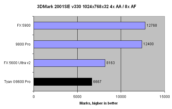 A silly setting for a midrange card, but it does go to show that bandwidth-crippled cards are ill-equipped to deal with a massive number of pixels and reads. That's kind of stating the obvious, and the numbers seem to concur. The FX 5600 Ultra's lead in this synthetic benchmark is of a little concern. We'll see how The Tachyon G9600 Pro and FX 5600U fare in real-world benchmarks.