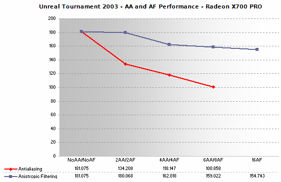 Whereas the XT wouldn't apply 16X anisotropic filtering, the X700 PRO was happy to do so. 2X is free in the simple UT2003 case, 4X drops off slightly and 8X and 16X show off their highly angle-adaptive nature by being applied to a bare minimum of the UT2003 test frames. On both boards, the performance hit for each mode is broadly similar.